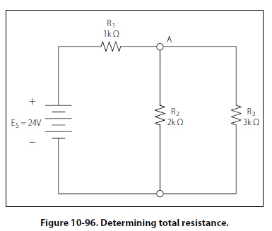 Determining the Total Resistance A more quantitative example for determining total resistance and the current in each branch in a combination circuit is shown in the following example. Also refer to Figure 10-96.