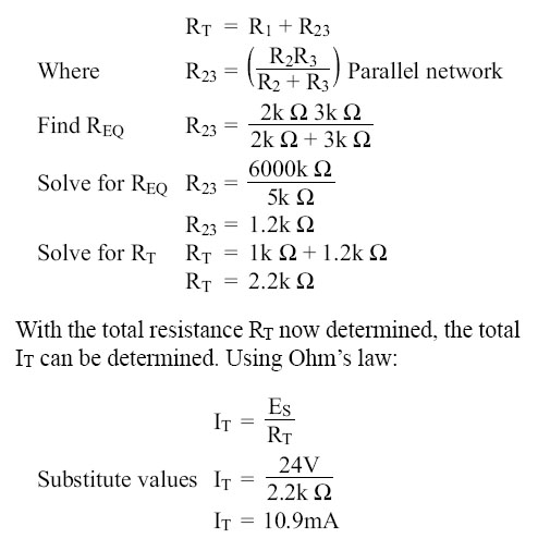 The first step is to determine the current at junction A, leading into the parallel branch. To determine the IT, the total resistance RT of the entire circuit must be known. The total resistance of the circuit is given as: