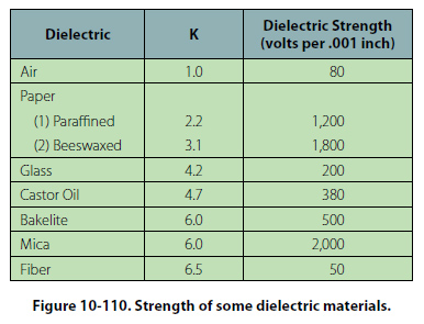 The strength of some commonly used dielectric materials is listed in Figure 10-110. The voltage rating also depends on frequency because the losses, and the resultant heating effect, increase as the frequency increases.