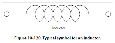 Types of Inductors Inductors used in radio can range from a straight wire at UHF to large chokes and transformers used for filtering the ripple from the output of power supplies and in audio amplifiers. Figure 10-69 shows the schematic symbols for common inductors. Values of inductors range from nano-henries to tens of henries. Inductors are classified by the type of core and the method of winding them. The number of turns in the inductor winding and the core material determine the capacity of the inductor. Cores made of dielectric material like ceramics, wood, paper provide small amounts of stored energy while cores made of ferrite substances have a much higher degree of stored energy. The core material is usually the most important aspect of the inductors construction. The conductors typically used in the construction of an inductor offer little resistance to the flow of current. However, with the introduction of a core, resistance is introduced in the circuit and the current now builds up in the windings until the resistance of the core is overcome. This buildup is stored as magnetic energy in the core. Depending on the core resistance, the buildup soon reaches a point of magnetic saturation and it can be released when necessary. The most common core materials are: Air, solid ferrite, powdered ferrite, steel, toroid and ferrite toroid. Units of Inductance The henry is the basic unit of inductance and is symbolized with the letter H. An electric circuit has an inductance of one henry when current changing at the rate of one ampere per second induces a voltage of one volt into the circuit. In many practical applications, millihenries (mH) and microhenries (µH) are more common units. The typical symbol for an inductor is shown in Figure 10-120.