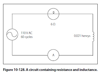 This formula can be used to determine the impedance when the values of inductive reactance and resistance are known. It can be modified to solve for impedance in circuits containing capacitive reactance and resistance by substituting XC in the formula in place of XL. In circuits containing resistance with both inductive and capacitive reactance, the reactances can be combined, but because their effects in the circuit are exactly opposite, they are combined by subtraction: X = XL - XC or X = XC - XL (the smaller number is always subtracted from the larger). In Figure 10-128, a series circuit consisting of resistance and inductance connected in series is connected to a source of 110 volts at 60 cycles per second. The resistive element is a lamp with 6 ohms resistance, and the inductive element is a coil with an inductance of 0.021 henry. What is the value of the impedance and the current through the lamp and the coil?