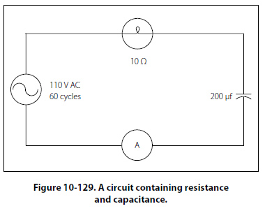 In Figure 10-129, a series circuit is illustrated in which a capacitor of 200 µf is connected in series with a 10 ohm lamp.