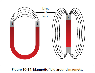 The somewhat mysterious and completely invisible force of a magnet depends on a magnetic field that surrounds the magnet as illustrated in Figure 10-14. This field always exists between the poles of a magnet, and will arrange itself to conform to the shape of any magnet.