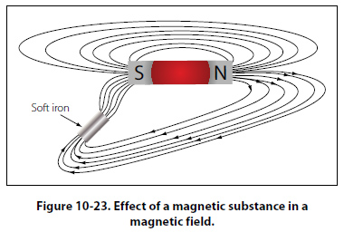 Materials such as soft iron and other ferrous metals are said to have a high permeability, the measure of the ease with which magnetic flux can penetrate a material. The permeability scale is based on a perfect vacuum with a rating of one. Air and other nonmagnetic materials are so close to this that they are also considered to have a rating of one. The nonferrous metals with a permeability greater than one, such as nickel and cobalt, are called paramagnetic. The term ferromagnetic is applied to iron and its alloys, which have by far the greatest permeability. Any substance, such as bismuth, having a permeability of less than one, is considered diamagnetic. Reluctance, the measure of opposition to the lines of force through a material, can be compared to the resistance of an electrical circuit. The reluctance of soft iron, for instance, is much lower than that of air. Figure 10-23 demonstrates that a piece of soft iron placed near the field of a magnet can distort the lines of force, which follow the path of lowest reluctance through the soft iron.