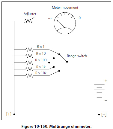 Megger (Megohmmeter) The megger, or megohmmeter, is a high range ohmmeter containing a hand-operated generator. It is used to measure insulation resistance and other high resistance values. It is also used for ground, continuity, and short circuit testing of electrical power systems. The chief advantage of the megger over an ohmmeter is its capacity to measure resistance with a high potential, or “breakdown" voltage. This type of testing ensures that insulation or a dielectric material will not short or leak under potential electrical stress. The megger consists of two primary elements, both of which are provided with individual magnetic fields from a common permanent magnet: (1) a hand-driven DC generator, G, which supplies the necessary current for making the measurement, and (2) the instrument portion, which indicates the value of the resistance being measured. The instrument portion is of the opposed coil type. Coils A and B are mounted on the movable member with a fixed angular relationship to each other and are free to turn as a unit in a magnetic field. Coil B tends to move the pointer counterclockwise and coil A, clockwise. The coils are mounted on a light, movable frame that is pivoted in jewel bearings and free to move about axis 0. [Figure 10-151]