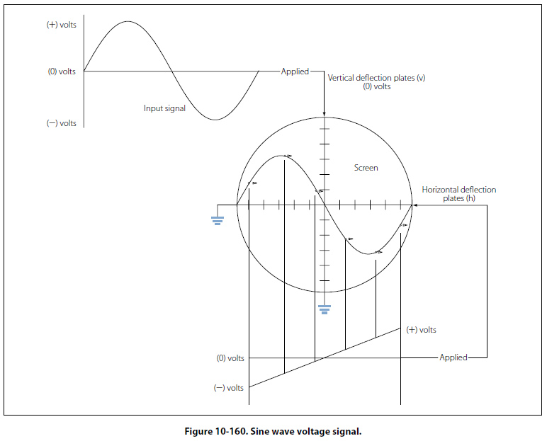 Vertical Deflection If this same signal were applied to the vertical plates, it would also produce a vertical line by causing the beam to trace from the down position to the up position. Tracing a Sine Wave Reproducing the sine wave on the oscilloscope combines both the vertical and horizontal deflection patterns. [Figure 10-160] If the sine wave voltage signal is applied across the vertical deflection plates, the result will be the vertical beam oscillation up and down on the screen. The amount that the beam moves above the centerline will depend on the peak value of the voltage.
