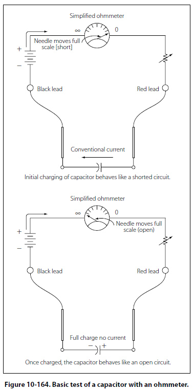 Continuity Checks In many cases, the ohmmeter is not used for measuring the resistance of a component but to simply check the integrity of a connection from one portion of a circuit to another. If there is a good connection, then the ohmmeter will read a near zero resistance or a short. If the circuit is open or has a very poor connection at some point like an over-crimped pin in a connector, then the ohmmeter will read infinity or some very high resistance. Keep in mind that while any measurement is being taken, contact with the circuit or probes should be avoided. Contact can introduce another parallel path and provide misleading indications. Capacitance Measurement Figure 10-164 illustrates a basic test of a capacitor with an ohmmeter. There are usually two common modes of fail for a capacitor. One is a complete failure characterized by short circuit through the capacitor due to the dielectric breaking down or an open circuit. The more insidious failure occurs due to degradation, which is a gradual deterioration of the capacitor’s characteristics.