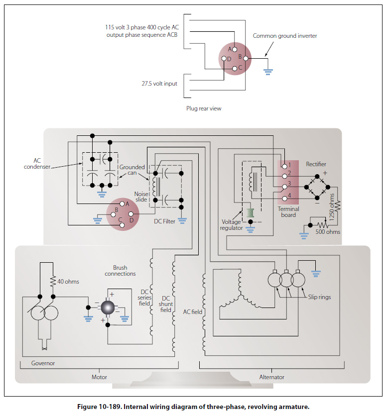 Inverters An inverter is used in some aircraft systems to convert a portion of the aircraft’s DC power to AC. This AC is used mainly for instruments, radio, radar, lighting, and other accessories. These inverters are usually built to supply current at a frequency of 400 cps, but some are designed to provide more than one voltage; for example, 26 volt AC in one winding and 115 volts in another. There are two basic types of inverters: the rotary and the static. Either type can be single phase or multiphase. The multiphase inverter is lighter for the same power rating than the single phase, but there are complications in distributing multiphase power and in keeping the loads balanced. Rotary Inverters There are many sizes, types, and configurations of rotary inverters. Such inverters are essentially AC generators and DC motors in one housing. The generator field, or armature, and the motor field, or armature, are mounted on a common shaft that will rotate within the housing. One common type of rotary inverter is the permanent magnet inverter. Permanent Magnet Rotary Inverter A permanent magnet inverter is composed of a DC motor and a permanent magnet AC generator assembly. Each has a separate stator mounted within a common housing. The motor armature is mounted on a rotor and connected to the DC supply through a commutator and brush assembly. The motor field windings are mounted on the housing and connected directly to the DC supply. A permanent magnet rotor is mounted at the opposite end of the same shaft as the motor armature, and the stator windings are mounted on the housing, allowing AC to be taken from the inverter without the use of brushes. Figure 10-188 shows an internal wiring diagram for this type of rotary inverter. The generator rotor has six poles, magnetized to provide alternate north and south poles about its circumference. When the motor field and armature are excited, the rotor will begin to turn. As the rotor turns, the permanent magnet will rotate within the AC stator coils, and the magnetic flux developed by the permanent magnets will be cut by the conductors in the AC stator coils. An AC voltage will be produced in the windings whose polarity will change as each pole passes the windings. This type inverter may be made multiphase by placing more AC stator coils in the housing in order to shift the phase the proper amount in each coil. As the name of the rotary inverter indicates, it has a revolving armature in the AC generator section. The illustration in Figure 10-189 shows the diagram of a revolving armature, three phase inverter.
