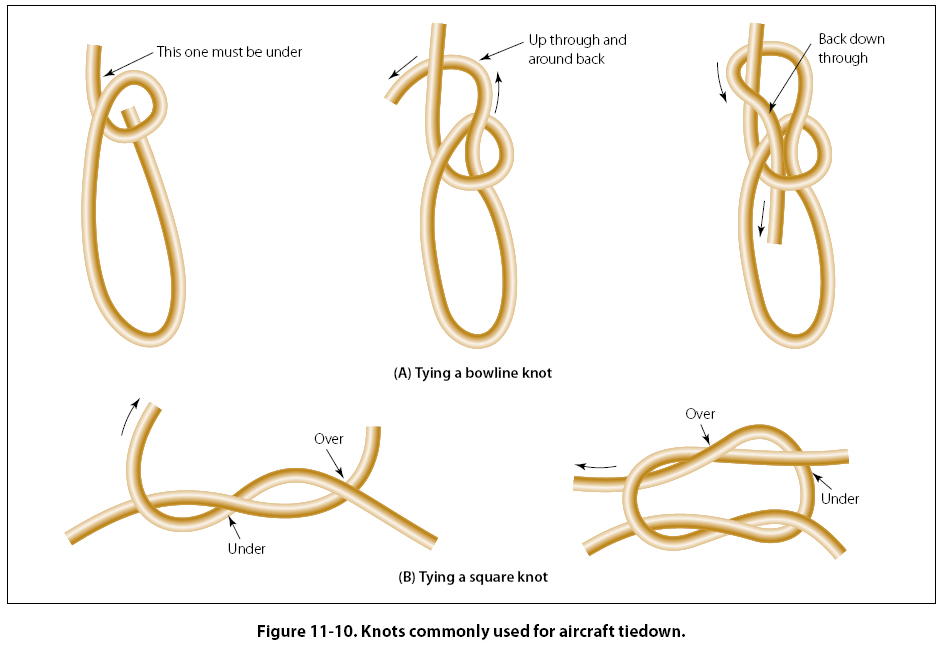 Chapter 11. Safety, Ground Operations, & Servicing Tiedown Procedures for Land Planes Securing Light Aircraft Light aircraft are most often secured with ropes tied only at the aircraft tiedown rings provided for securing purposes. Rope should never be tied to a lift strut, since this practice can bend a strut if the rope slips to a point where there is no slack. Manila rope shrinks when wet; about 1 inch (1") of slack should be provided for movement. Too much slack allows the aircraft to jerk against the ropes. Tight tiedown ropes put inverted flight stresses on the aircraft, many of which are not designed to take such loads. A tiedown rope holds no better than the knot. Anti-slip knots such as the bowline are quickly tied and are easy to untie. [Figure 11-10] Aircraft not equipped with tiedown fittings should be secured in accordance with the manufacturer’s instructions. Ropes should be tied to outer ends of struts on high-wing monoplanes, and suitable rings should be provided where structural conditions permit, if the manufacturer has not already provided them.