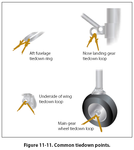 Securing Heavy Aircraft The normal tiedown procedure for heavy aircraft can be accomplished with rope or cable tiedown. The number of such tiedowns should be governed by anticipated weather conditions. Most heavy aircraft are equipped with surface control locks, which should be engaged or installed when the aircraft is secured. Since the method of locking controls will vary on different type aircraft, check the manufacturer’s instructions for proper installation or engaging procedures. If high winds are anticipated, control surface battens can also be installed to prevent damage. Figure 11-11 illustrates four common tiedown points on heavy aircraft.