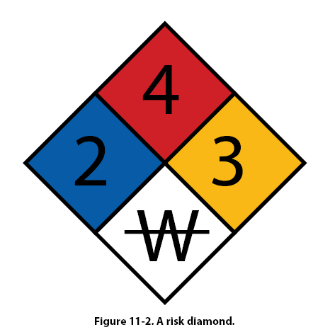 Many accidents involving compressed gases occur during aircraft tire mounting. To prevent possible personal injury, use tire dollies and other appropriate lifting and mounting devices in mounting or removing heavy aircraft tires. When inflating tires on any type of aircraft wheels, always use tire cage guards. Because of possible personal injury, extreme caution is required to avoid overinflation of high pressure tires. Use pressure regulators on high pressure air bottles to eliminate the possibility of overinflation of tires. Tire cages need not be used when adjusting pressure in tires installed on aircraft. Safety Around Hazardous Materials Material safety diamonds are very important with regard to shop safety. These forms and labels are a simple and quick way to determine the risk and, if used properly with the tags, will indicate what personal safety equipment to use with the hazardous material. The most observable portion of the Material Safety Data Sheet (MSDS) label is the risk diamond. It is a four color segmented diamond that represents Flammability (Red), Reactivity (Yellow), Health (Blue), and special Hazard (White). In the Flammability, Reactivity, and Health blocks, there should be a number from 0 to 4. Zero represents little or no hazard to the user; 4 means that the material is very hazardous. The special hazard segment contains a word or abbreviation to represent the special hazard. Some examples are: RAD for radiation, ALK for alkali materials, Acid for acidic materials, and CARC for carcinogenic materials. The letter W with a line through it stands for high reactivity to water. [Figure 11-2]
