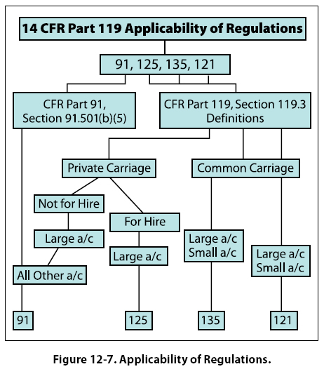 AC 120-12, as revised, provides the following definition regarding the above criteria: “A carrier becomes a common carrier when it “holds itself out" to the public, or to a segment of the public, as willing to furnish transportation within the limits of its facilities to any person who wants it. There are four elements in defining a common carrier; (1) a holding out of a willingness to (2) transport persons or property (3) from place to place (4) for compensation. This “holding out" which makes a person a common carrier can be done in many ways and it does not matter how it is done. Signs and advertising are the most direct means of “holding out" but are not the only ones… Carriage for hire which does not involve “holding out" is private carriage. Private carriers for hire are sometimes called “contract carriers," but the term is borrowed from the Interstate Commerce Act and legally inaccurate when used in connection with the Federal Aviation Act. Private carriage for hire is carriage for one or several selected customers, generally on a long term basis. The number of contracts must not be too great; otherwise, it implies a willingness to make a contract with anybody.A carrier operating pursuant to 18 to 24 contracts has been held to be a common carrier because it held itself out to serve the public generally to the extent of its facilities. Private carriage has been found in cases where three contracts have been the sole basis of the operator’s business." Operations that constitute common carriage are required to be conducted under 14 CFR part 121 or 135. Private carriage may be conducted under part 91 or 125. The term “for hire" is not defined in any of the FAA documents, but is generally understood to mean that compensation for both direct and indirect expenses associated with the flight, as well as a profit margin for the operator are collected from the person or persons benefiting from the flight operation. The determination of whether the aircraft is large or small is based upon the definition provided in 14 CFR part 1 (i.e., if the aircraft has maximum certificated takeoff weight of 12,500 pounds or more, it is a large aircraft. All aircraft less than 12,500 maximum certificated takeoff weight are considered to be small aircraft). It may also help the reader understand when 121, 125, and 135 regulations apply, by taking a brief look at a list of flight operations to which part 119 does not apply.