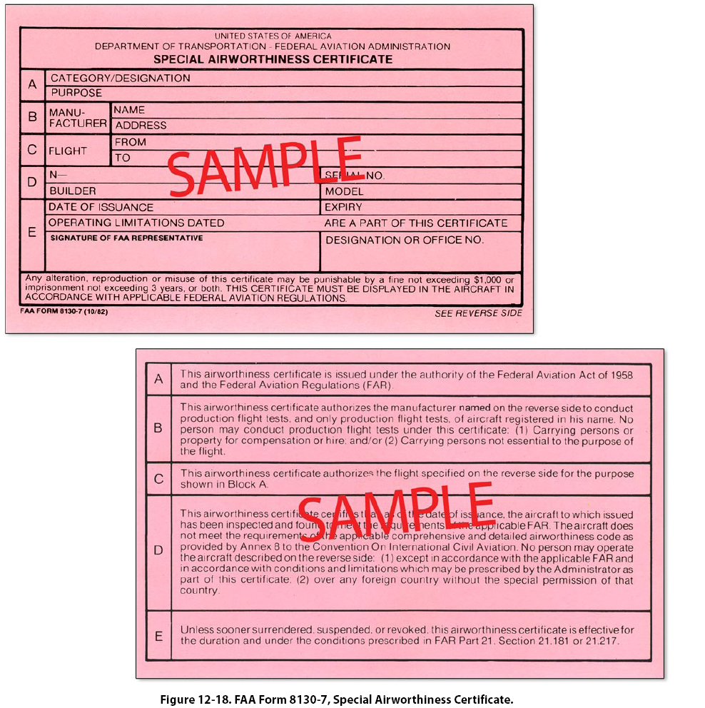 FAA Form 8130-7, Special Airworthiness Certificate, may be issued to authorize the operation of an aircraft in the following categories: [Figure 12-18]