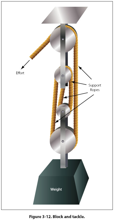 Block and Tackle A block and tackle is made up of multiple pulleys, some of them fixed and some movable. In Figure 3-12, the block and tackle is made up of four pulleys, the top two being fixed and the bottom two being movable.