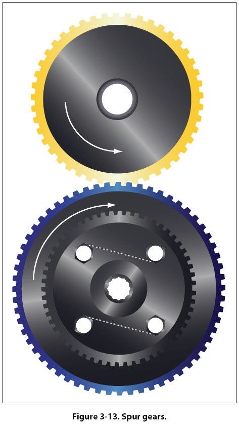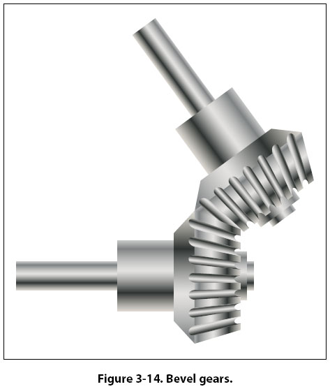 Imagine that the blue gear is driving the yellow one (blue is the drive, yellow is the driven). The mechanical advantage in terms of force would be the effort arm divided by the resistance arm, or 9 ÷ 12, which is 0.75. This would actually be called a fractional disadvantage, because there would be less force out than force in. The mechanical advantage in terms of distance (rpm in this case), would be 12 ÷ 9, or 1.33. This analysis tells us that when a large gear drives a small one, the small one turns faster and has less available force. In order to be a force gaining machine, the small gear needs to turn the large one. When the terminology reduction gearbox is used, such as a propeller reduction gearbox, it means that there is more rpm going in than is coming out. The end result is an increase in force, and ultimately torque. Bevel gears are used to change the plane of rotation, so that a shaft turning horizontally can make a vertical shaft rotate. The size of the gears and their number of teeth determine the mechanical advantage, and whether force is being increased or rpm is being increased. If each gear has the same number of teeth, there would be no change in force or rpm. [Figure 3-14]