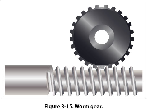 The worm gear has an extremely high mechanical advantage. The input force goes into the spiral worm gear, which drives the spur gear. One complete revolution of the worm gear only makes the spur gear turn an amount equal to one tooth. The mechanical advantage is equal to the number of teeth on the spur gear, which in this case is 25. This is a force gaining machine, to the tune of 25 times more output force. [Figure 3-15]