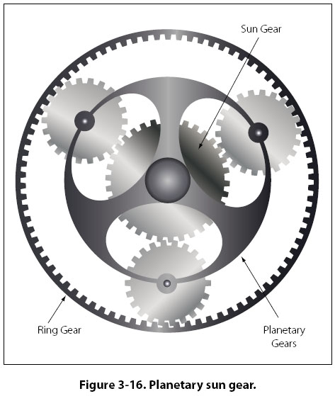 The planetary sun gear system is typical of what would be found in a propeller reduction gearbox. The power output shaft of the engine would drive the sun gear in the middle, which rotates the planetary gears and ultimately the ring gear. In this example, the sun gear has 28 teeth, each planet gear has 22 teeth, and the ring gear has 82 teeth. To figure how much gear reduction is taking place, the number of teeth on the ring gear is divided by the number of teeth on the sun gear. In this case, the gear reduction is 2.93, meaning the engine has an rpm 2.93 times greater than the propeller. [Figure 3-16]