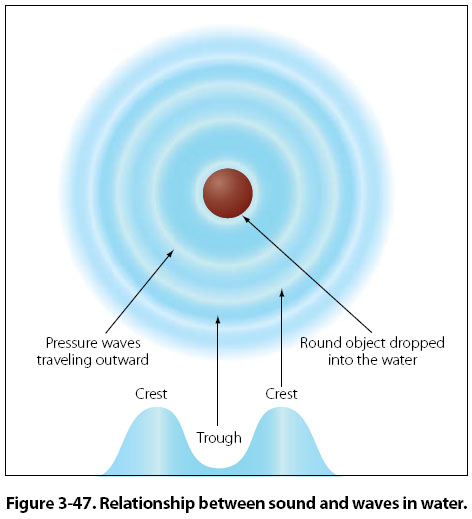Wave Motion Since sound is a wave motion in matter, it can best be understood by first considering water waves. When an object is thrown into a pool, a series of circular waves travel away from the disturbance. In Figure 3-47 such waves are seen from a top perspective, with the waves traveling out from the center. In the cross-section perspective in Figure 3-47, notice that the water waves are a succession of crests and troughs. The wavelength is the distance from the crest of one wave to the crest of the next. Water waves are known as transverse waves because the motion of the water molecules is up and down, or at right angles to the direction in which the waves are traveling. This can be seen by observing a cork on the water, bobbing up and down as the waves pass by.