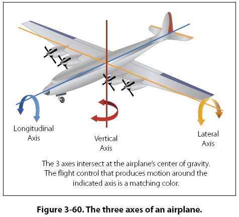 Upwash and downwash refer to the effect an airfoil has on the free airstream. Upwash is the deflection of the oncoming airstream, causing it to flow up and over the wing. Downwash is the downward deflection of the airstream after it has passed over the wing and is leaving the trailing edge. This downward deflection is what creates the action and reaction described under lift and Newton’s third law. Axes of an Aircraft An airplane in flight is controlled around one or more of three axes of rotation. These axes of rotation are the longitudinal, lateral, and vertical. On the airplane, all three axes intersect at the center of gravity (CG). As the airplane pivots on one of these axes, it is in essence pivoting around the center of gravity (CG). The center of gravity is also referred to as the center of rotation. On the brightly colored airplane shown in Figure 3-60, the three axes are shown in the colors red (vertical axis), blue (longitudinal axis), and orange (lateral axis). The flight control that makes the airplane move around the axis is shown in a matching color.