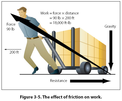 Friction and Work In calculating work done, the actual resistance overcome is measured. This is not necessarily the weight of the object being moved. [Figure 3-5] A 900-lb load is being pulled a distance of 200 ft. This does not mean that the work done (force × distance) is 180,000 ft-lb (900 lb × 200 ft). This is because the person pulling the load is not working against the total weight of the load, but rather against the rolling friction of the cart, which may be no more than 90 lb. Friction is an important aspect of work. Without friction it would be impossible to walk. One would have to shove oneself from place to place, and would have to bump against some obstacle to stop at a destination. Yet friction is a liability as well as an asset, and requires consideration when dealing with any moving mechanism.