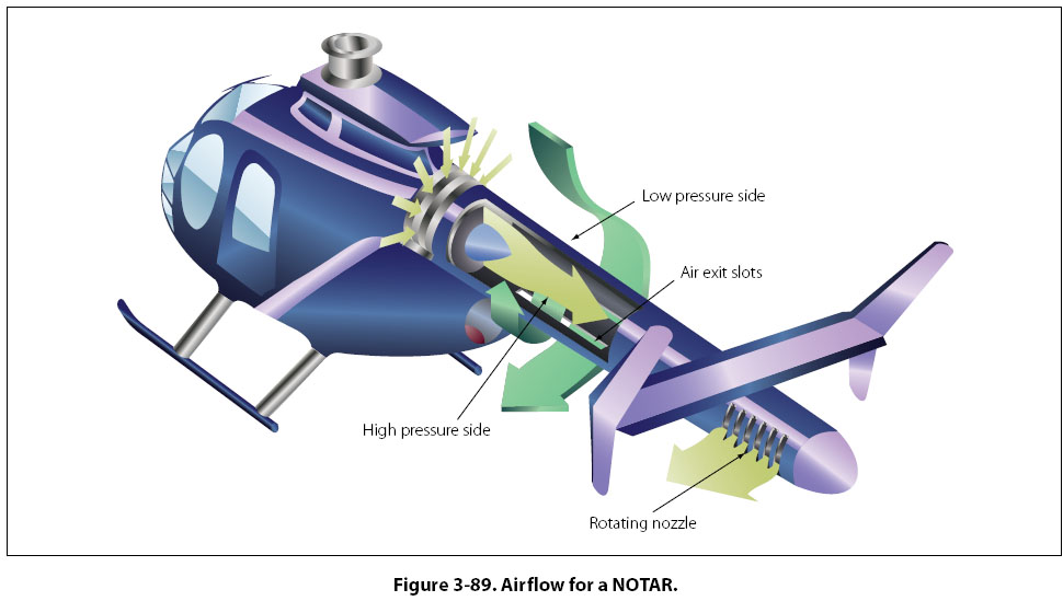 A third method of counteracting the torque of the helicopter’s main rotor is a technique called the “no tail rotor" system, or NOTAR. This system uses a high volume of air at low pressure, which comes from a fan driven by the helicopter’s engine. The fan forces air into the tail boom, where a portion of it exits out of slots on the right side of the boom and, in conjunction with the main rotor downwash, creates a phenomenon called the “Coanda effect." The air coming out of the slots on the right side of the boom causes a higher velocity, and therefore lower pressure, on that side of the boom. The higher pressure on the left side of the boom creates the primary force that counteracts the torque of the main rotor. The remainder of the air travels back to a controllable rotating nozzle in the helicopter’s tail. The air exits the nozzle at a high velocity, and creates an additional force (thrust) that helps counteracts the torque of the main rotor. A NOTAR system is shown in Figures 3-88 and 3-89.