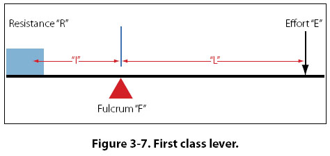 The concept of torque was discussed earlier in this chapter, and torque is very much involved in the operation of a lever. When a person sits on one end of a seesaw, that person applies a downward force in pounds which acts along the distance to the center of the seesaw. This combination of force and distance creates torque, which tries to cause rotation. First Class Lever In the first class lever, the fulcrum is located between the effort and the resistance. As mentioned earlier, the seesaw is a good example of a lever, and it happens to be a first class lever. The amount of weight and the distance from the fulcrum can be varied to suit the need. Increasing the distance from the applied effort to the fulcrum, compared to the distance from the fulcrum to the weight being moved, increases the advantage provided by the lever. Crowbars, shears, and pliers are common examples of this class of lever. The proper balance of an airplane is also a good example, with the center of lift on the wing being the pivot point (fulcrum) and the weight fore and aft of this point being the effort and the resistance. When calculating how much effort is required to lift a specific weight, or how much weight can be lifted by a specific effort, the following formula can be used. Effort (E) × Effort Arm (L) = Resistance (R) × Resistance Arm (l) What this formula really shows is the input torque (effort times effort arm) equals the output torque (resistance times resistance arm). This formula and concept apply to all three classes of levers, and to all simple machines in general. Example: A first class lever is to be used to lift a 500-lb weight. The distance from the weight to the fulcrum is 12 inches and from the fulcrum to the applied effort is 60 inches. How much force is required to lift the weight? Effort (E) × Effort Arm (L) = Resistance (R) × Resistance Arm (l) The mechanical advantage of the lever in this example would be: Mechanical Advantage = Force Out ÷ Force In An interesting thing to note with this example lever is if the applied effort moved down 10 inches, the weight on the other end would only move up 2 inches. The weight being lifted would only move one-fifth as far. The reason for this is the concept of work. Because a lever cannot have more work output than input, if it allows you to lift 5 times more weight, you will only move it 1/5 as far as you move the effort. Second Class Lever The second class lever has the fulcrum at one end and the effort is applied at the other end. The resistance is somewhere between these points. A wheelbarrow is a good example of a second class lever, with the wheel at one end being the fulcrum, the handles at the opposite end being the applied effort, and the bucket in the middle being where the weight or resistance is placed. [Figure 3-8]