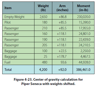 Based on the information in the Type Certificate Data Sheet, the maximum takeoff weight of this airplane is 4,200 lb, and the aft-most CG limit is +94.6". The loaded airplane in the chart above is 25 lb too heavy, and the CG is 1.82" too far aft. To make the airplane safe to fly, the load needs to be reduced by 25 lb and some of the load needs to be shifted forward. For example, the baggage can be reduced by 25 lb, and a full 100 lb of it can be placed in the more forward compartment. One passenger can be moved to the forward seat next to the pilot, and the aft-most passenger can then be moved forward. If these changes are made, the four column calculation will be as shown in Figure 4-23.