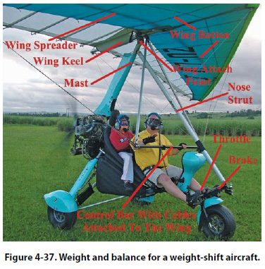 Weight and Balance— Weight-Shift Control Aircraft and Powered Parachutes The terminology, theory, and concepts of weight and balance that applies to airplanes also applies to weightshift aircraft and powered parachutes. Weight is still weight, and the balance point is still the balance point. There are, however, a few differences that need to be discussed. Before reading about the specifics of weight and balance on weight-shift control and powered parachute aircraft, be sure to read about their aerodynamic characteristics in Chapter 3, Physics. Weight-shift control aircraft and powered parachutes do not fall under the same Code of Federal Regulations that govern certified airplanes and helicopters and, therefore, do not have Type Certificate Data Sheets or the same type of FAA mandated weight and balance reports. Weight and balance information and guidelines are left to the individual owners and the companies with which they work in acquiring this type of aircraft. Overall, the industry that is supplying these aircraft is regulating itself well, and the safety record is good for those aircraft being operated by experienced pilots. The FAA has recently (2005) accepted a new classification of aircraft, known as Light Sport Aircraft (LSA). A new set of standards is being developed which will have an impact on the weight-shift control and powered parachute aircraft and how their weight and balance is handled. Weight-Shift Control Aircraft Weight-shift control aircraft, commonly known by the name “trikes," have very few options for loading because they have very few places to put useful load items. Some trikes have only one seat and a fuel tank, so the only variables for a flight are amount of fuel and weight of the pilot. Some trikes have two seats and a small storage bin, in addition to the fuel tank. The most significant factor affecting the weight and balance of a trike is the weight of the pilot; if the aircraft has two seats, the weight of the passenger must be considered. The trike acts somewhat like a single main rotor helicopter because the weight of the aircraft is hanging like a pendulum under the wing. Figure 4-37 shows a two-place trike, in which the mast and the nose strut come together slightly below the wing attach point. When the trike is in flight, the weight of the aircraft is hanging from the wing attach point. The weight of the engine and fuel is behind this point, the passenger is almost directly below this point, and the pilot is forward of this point. The balance of the aircraft is determined by how all these weights compare.