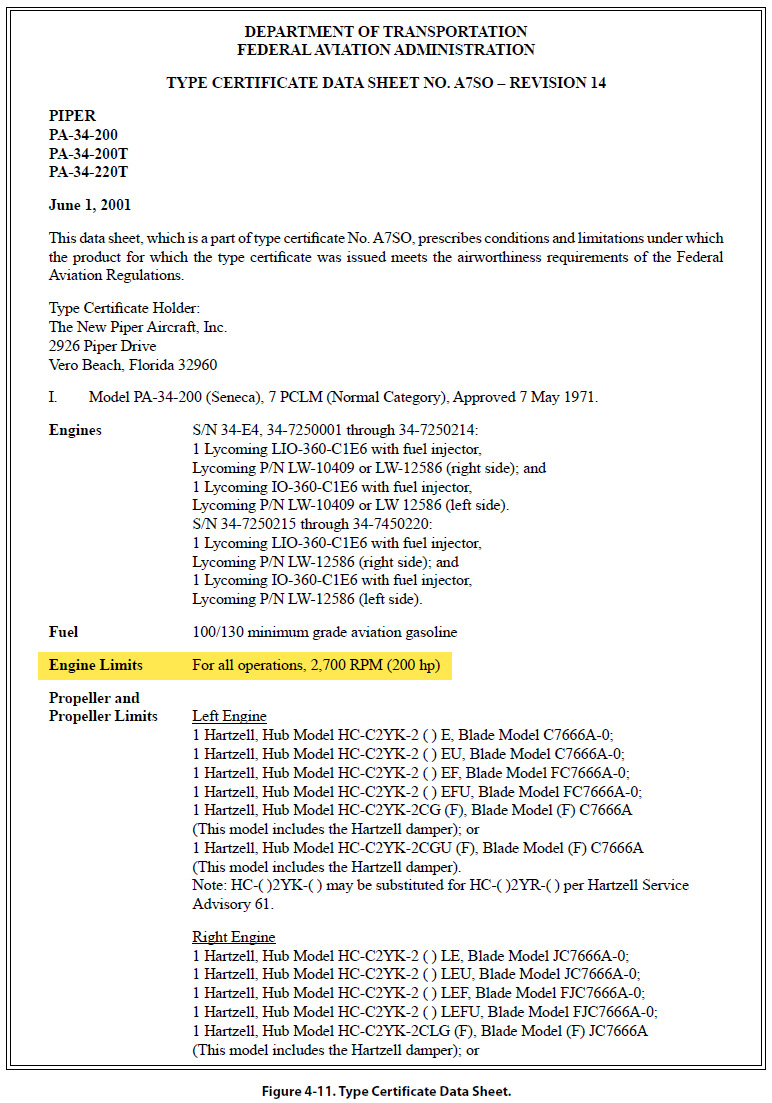 The document in Figure 4-11 is a Type Certificate Data Sheet (TCDS) for a Piper twin-engine airplane known as the Seneca (PA-34-200). The main headings for the information typically contained in a TCDS are included, but much of the information contained under these headings has been removed if it did not directly pertain to weight and balance. Information on only one model of Seneca is shown, because to show all the different models would make the document excessively long. The portion of the TCDS that has the most direct application to weight and balance is highlighted in yellow. Some of the important weight and balance information found in a Type Certificate Data Sheet is as follows: 1. Center of gravity range 2. Maximum weight 3. Leveling means 4. Number of seats and location 5. Baggage capacity 6. Fuel capacity 7. Datum location 8. Engine horsepower 9. Oil capacity 10. Amount of fuel in empty weight 11. Amount of oil in empty weight