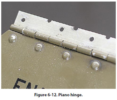 Wheel Well and Landing Gear More than any other area on the aircraft, this area probably receives more punishment due to mud, water, salt, gravel, and other flying debris. Because of the many complicated shapes, assemblies, and fittings, complete area paint film coverage is difficult to attain and maintain. A partially applied preservative tends to mask corrosion rather than prevent it. Due to heat generated by braking action, preservatives cannot be used on some main landing gear wheels. During inspection of this area, pay particular attention to the following trouble spots: 1. Magnesium wheels, especially around bolt heads, lugs, and wheel web areas, particularly for the presence of entrapped water or its effects 2. Exposed rigid tubing, especially at B-nuts and ferrules, under clamps and tubing identification tapes 3. Exposed position indicator switches and other electrical equipment 4. Crevices between stiffeners, ribs, and lower skin surfaces, which are typical water and debris traps Water Entrapment Areas Design specifications require that aircraft have drains installed in all areas where water may collect. Daily inspection of low point drains should be a standard requirement. If this inspection is neglected, the drains may become ineffective because of accumulated debris, grease, or sealants. Engine Frontal Areas and Cooling Air Vents These areas are being constantly abraded with airborne dirt and dust, bits of gravel from runways, and rain erosion, which tends to remove the protective finish. Inspection of these areas should include all sections in the cooling air path, with special attention to places where salt deposits may be built up during marine operations. It is imperative that incipient corrosion be inhibited and that paint touchup and hard film preservative coatings are maintained intact on seaplane and amphibian engine surfaces at all times. Wing Flap and Spoiler Recesses Dirt and water may collect in flap and spoiler recesses and go unnoticed because they are normally retracted. For this reason, these recesses are potential corrosion problem areas. Inspect these areas with the spoilers and/or flaps in the fully deployed position. External Skin Areas External aircraft surfaces are readily visible and accessible for inspection and maintenance. Even here, certain types of configurations or combinations of materials become troublesome under certain operating conditions and require special attention. Relatively little corrosion trouble is experienced with magnesium skins if the original surface finish and insulation are adequately maintained. Trimming, drilling, and riveting destroy some of the original surface treatment, which is never completely restored by touchup procedures. Any inspection for corrosion should include all magnesium skin surfaces with special attention to edges, areas around fasteners, and cracked, chipped, or missing paint. Piano-type hinges are prime spots for corrosion due to the dissimilar metal contact between the steel pin and aluminum hinge. They are also natural traps for dirt, salt, and moisture. Inspection of hinges should include lubrication and actuation through several cycles to ensure complete lubricant penetration. Use water-displacing lubricants when servicing piano hinges. [Figures 6-12 and 6-13]