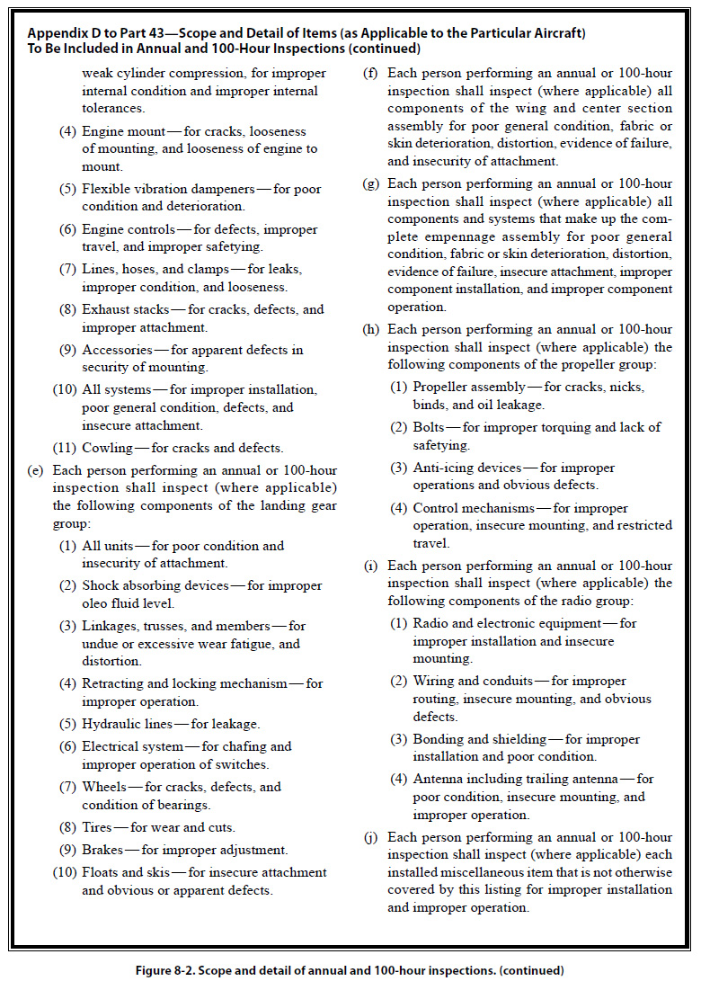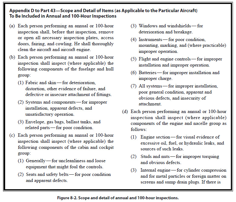 Annual/100-Hour Inspections Title 14 of the Code of Federal Regulations (14 CFR) part 91 discusses the basic requirements for annual and 100-hour inspections. With some exceptions, all aircraft must have a complete inspection annually. Aircraft that are used for commercial purposes and are likely to be used more frequently than noncommercial aircraft must have this complete inspection every 100 hours. The scope and detail of items to be included in annual and 100-hour inspections is included as appendix D of 14 CFR part 43 and shown as Figure 8-2.