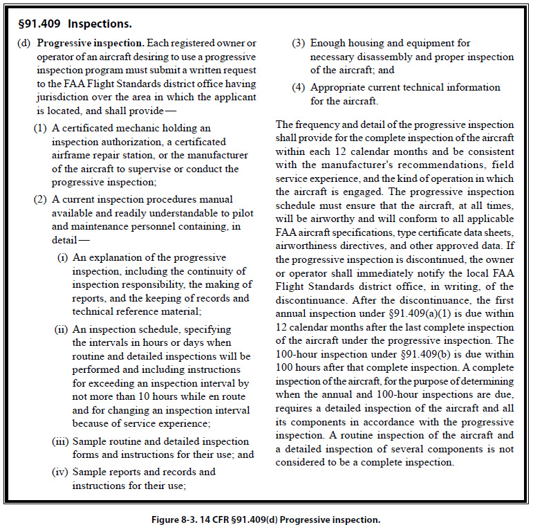 A properly written checklist, such as the one shown earlier in this chapter, will include all the items of appendix D. Although the scope and detail of annual and 100-hour inspections is identical, there are two significant differences. One difference involves persons authorized to conduct them. A certified airframe and powerplant maintenance technician can conduct a 100- hour inspection, whereas an annual inspection must be conducted by a certified airframe and powerplant maintenance technician with inspection authorization (IA). The other difference involves authorized overflight of the maximum 100 hours before inspection. An aircraft may be flown up to 10 hours beyond the 100-hour limit if necessary to fly to a destination where the inspection is to be conducted. Progressive Inspections Because the scope and detail of an annual inspection is very extensive and could keep an aircraft out of service for a considerable length of time, alternative inspection programs designed to minimize down time may be utilized. A progressive inspection program allows an aircraft to be inspected progressively. The scope and detail of an annual inspection is essentially divided into segments or phases (typically four to six). Completion of all the phases completes a cycle that satisfies the requirements of an annual inspection. The advantage of such a program is that any required segment may be completed overnight and thus enable the aircraft to fly daily without missing any revenue earning potential. Progressive inspection programs include routine items such as engine oil changes and detailed items such as flight control cable inspection. Routine items are accomplished each time the aircraft comes in for a phase inspection and detailed items focus on detailed inspection of specific areas. Detailed inspections are typically done once each cycle. A cycle must be completed within 12 months. If all required phases are not completed within 12 months, the remaining phase inspections must be conducted before the end of the 12th month from when the first phase was completed. Each registered owner or operator of an aircraft desiring to use a progressive inspection program must submit a written request to the FAA Flight Standards District Office (FSDO) having jurisdiction over the area in which the applicant is located. Title 14 of the Code of Federal Regulations (14 CFR) part 91, §91.409(d) establishes procedures to be followed for progressive inspections and is shown in Figure 8-3.