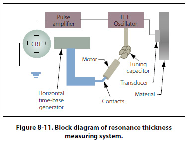 The beam or a portion thereof reflects successively from the surfaces of the material or any other discontinuity, including the edge of the piece. In straight beam testing, the horizontal distance on the screen between the initial pulse and the first back reflection represents the thickness of the piece; while in angle beam testing, this distance represents the width of the material between the searching unit and the opposite edge of the piece. Through Transmission Through transmission inspection uses two transducers, one to generate the pulse and another placed on the opposite surface to receive it. A disruption in the sound path will indicate a flaw and be displayed on the instrument screen. Through transmission is less sensitive to small defects than the pulse-echo method. Resonance This system differs from the pulse method in that the frequency of transmission may be continuously varied. The resonance method is used principally for thickness measurements when the two sides of the material being tested are smooth and parallel and the backside is inaccessible. The point at which the frequency matches the resonance point of the material being tested is the thickness determining factor. It is necessary that the frequency of the ultrasonic waves corresponding to a particular dial setting be accurately known. Checks should be made with standard test blocks to guard against possible drift of frequency. If the frequency of an ultrasonic wave is such that its wavelength is twice the thickness of a specimen (fundamental frequency), then the reflected wave will arrive back at the transducer in the same phase as the original transmission so that strengthening of the signal will occur. This results from constructive interference or a resonance and is shown as a high amplitude value on the indicating screen. If the frequency is increased such that three times the wavelength equals four times the thickness, the reflected signal will return completely out of phase with the transmitted signal and cancellation will occur. Further increase of the frequency causes the wavelength to be equal to the thickness again and gives a reflected signal in phase with the transmitted signal and a resonance once more. By starting at the fundamental frequency and gradually increasing the frequency, the successive cancellations and resonances can be noted and the readings used to check the fundamental frequency reading. [Figure 8-10]
