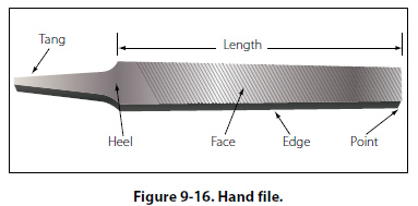 Files Most files are made of high-grade tool steels that are hardened and tempered. Files are manufactured in a variety of shapes and sizes. They are known either by the cross section, the general shape, or by their particular use. The cuts of files must be considered when selecting them for various types of work and materials. Files are used to square ends, file rounded corners, remove burrs and slivers from metal, straighten uneven edges, file holes and slots, and smooth rough edges. Files have three distinguishing features: (1) their length, measured exclusive of the tang [Figure 9-16]; (2) their kind or name, which has reference to the relative coarseness of the teeth; and (3) their cut.