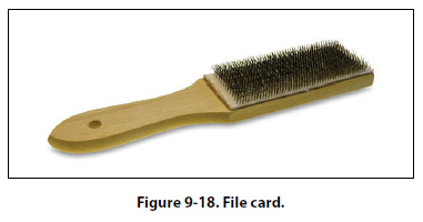 Particles of metal collect between the teeth of a file and may make deep scratches in the material being filed. When these particles of metal are lodged too firmly between the teeth and cannot be removed by tapping the edge of the file, remove them with a file card or wire brush. Draw the brush across the file so that the bristles pass down the gullet between the teeth. [Figure 9-18]
