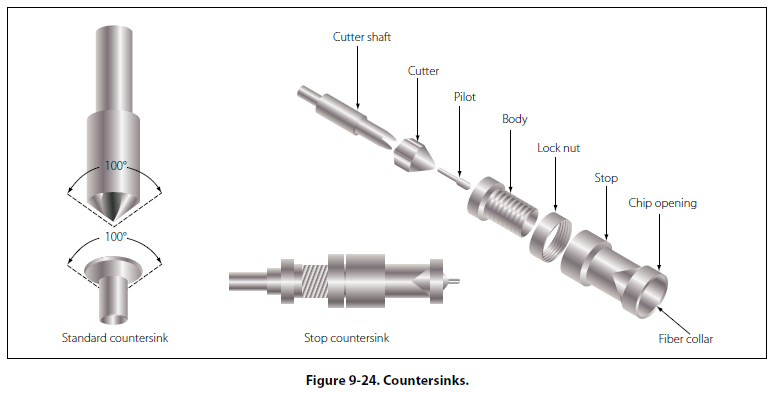 Countersink A countersink is a tool that cuts a cone shaped depression around the hole to allow a rivet or screw to set flush with the surface of the material. Countersinks are made with various angles to correspond to the various angles of the countersunk rivet and screwheads. The angle of the standard countersink shown in Figure 9-24 is 100°. Special stop countersinks are available. Stop countersinks are adjustable to any desired depth, and the cutters are interchangeable so that holes of various countersunk angles may be made. Some stop countersinks have a micrometer set arrangement (in increments of 0.001 inch) for adjusting the cutting depths. [Figure 9-24]