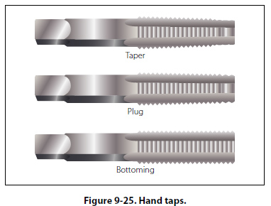 When using a countersink, care must be taken not to remove an excessive amount of material, since this reduces the strength of flush joints. Taps and Dies A tap is used to cut threads on the inside of a hole, while a die is for cutting external threads on round stock. They are made of hard tempered steel and ground to an exact size. There are four types of threads that can be cut with standard taps and dies. They are: National Coarse, National Fine, National Extra Fine, and National Pipe. Hand taps are usually provided in sets of three taps for each diameter and thread series. Each set contains a taper tap, a plug tap, and a bottoming tap. The taps in a set are identical in diameter and cross section; the only difference is the amount of taper. [Figure 9-25]