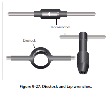 Solid dies are not adjustable; therefore, a variety of thread fits cannot be obtained with this type. There are many types of wrenches for turning taps, as well as turning dies. The T-handle, the adjustable tap wrench, and the diestock for round split dies shown in Figure 9-27 are a few of the more common types.