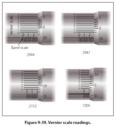 Vernier Scale Some micrometers are equipped with a vernier scale that makes it possible to directly read the fraction of a division that is indicated on the thimble scale. Typical examples of the vernier scale as it applies to the micrometer are shown in Figure 9-39.
