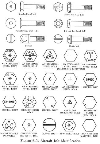 General Purpose Bolts The hex head aircraft bolt (AN-3 through AN-20) is an all purpose structural bolt used for general applications involving tension or shear loads where a light drive fit is permissible (0.006 inch clearance for a 5/8 inch hole, and other sizes in proportion). Alloy steel bolts smaller than No. 10-32 and aluminum alloy bolts smaller than 1/4 inch diameter are not used in primary structures. Aluminum alloy bolts and nuts are not used where they will be repeatedly removed for purposes of maintenance and inspection. Aluminum alloy nuts may be used with cadmium plated steel bolts loaded in shear on land airplanes, but are not used on seaplanes due to the increased possibility of dissimilar metal corrosion. The AN-73 drilled head bolt is similar to the standard hex bolt, but has a deeper head which is drilled to receive wire for safetying. The AN-3 and the AN-73 series bolts are interchangeable, for all practical purposes, from the standpoint of tension and shear strengths. |