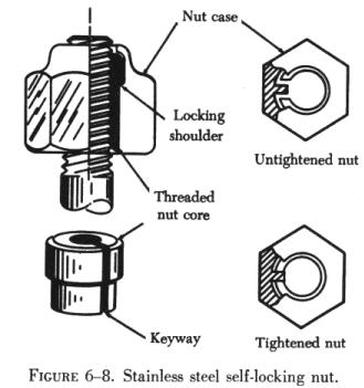 Most of the familiar types of nuts, including the plain nut, the castle nut, the castellated shear nut, the plain hex nut, the light hex nut, and the plain check nut are the nonselflocking type. (See figure 6-6.)
