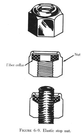 Nearly all elastic stop nuts are steel or aluminum alloy. However, such nuts are available in practically any kind of metal. Aluminum alloy elastic stop nuts are supplied with an anodized finish. Steel nuts are cadmium plated. Normally, elastic stop nuts can be used many times with complete safety and without detriment to their locking efficiency. When reusing elastic stop nuts, be sure the fiber has not lost its locking friction or become brittle. If a nut can be turned with the fingers, replace it. After the nut has been tightened, make sure the rounded or chamfered end of the bolts, studs, or screws extends at least the full round or chamfer through the nut. Flat end bolts, studs, or screws should extend at least 1/32 inch through the nut. Bolts of 5/16 inch diameter and over with cotter pin holes may be used with selflocking nuts, but only if free from burrs around the holes. Bolts with damaged threads and rough ends are not acceptable. Do not tap the fiber locking insert. The selflocking action of the elastic stop nut is the result of having the bolt threads impress themselves into the untapped fiber. |
