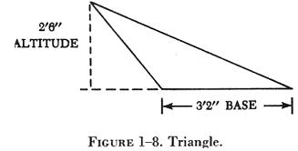 The altitude of a triangle is the perpendicular line drawn from the vertex to the base. In some triangles, as in figure 1-8, it may be necessary to extend the base so that the altitude will meet it. The base of a triangle is the side upon which the triangle is supposed to stand. Any side may be taken as the base. The area of any triangle may be calculated by using the formula: |