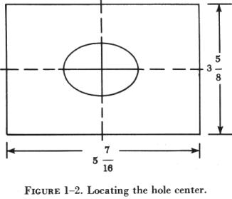 Find the distance the center of the hole (figure 1-2) is from the plate edges when the center of the hole is in the center of the plate. Express the length and width of the plate in decimal forms, and then divide each by 2. Express the final result to the nearest 32nd. FIRST: Change the mixed numbers to improper fractions.