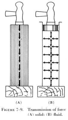 Therefore, the liquid remains at rest; it does not leak out and the tank does not collapse. One of the consequences of Pascal's law is that the shape of the container in no way alters pressure relations. Thus, in figure 7-11, if the pressure due to the weight of the liquid at one point on the horizontal line (H) is 8 psi, the pressure is 8 psi everywhere at level (H) in the system. Pressure due to the weight of a fluid depends, at any level, on the height of the fluid from the level to the surface of the fluid. The vertical distance between two horizontal levels in a fluid is known as the head of the fluid. In figure 7-11, the liquid head of all points on level (H) with respect to the surface is indicated. Pressure due to fluid head also depends on the density of the fluid. Water, for example, weighs 62.4 lbs/cu ft or 0.036 lb/cu in, but a certain oil might weigh 55 lbs/cu ft, or 0.032 lb/cu in. To produce a pressure of 8 psi, it would take 222 inches of head using water, and 252 inches of head using the oil (see figure 7-12). Force and Pressure In order to understand how Pascal's law is applied to fluid power, a distinction must be made between the terms "force" and "pressure." Force may be defined as a push or pull. It is the push or pull exerted against the total area of a particular surface and is expressed in pounds. As previously stated, pressure is the amount of force on a unit area of the surface acted upon. In hydraulics and pneumatics, pressure is expressed in pounds per square inch. Thus, pressure is the amount of force acting upon 1 square inch of area. Computing Force, Pressure, and Area A formula, similar to those used with the gas laws, is used in computing force, pressure, and area in fluid power systems. Although there appears to be three formulas, it is only one formula written in three variations, where P refers to pressure, F indicates force, and A represents area. Force equals pressure times area. Thus, the formula is written: F = P x A Pressure equals force divided by the area. By rearranging the formula, this statement is condensed into: