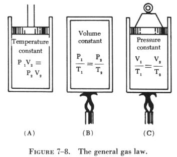 An examination of figure 7-8 reveals that the three equations are special cases of the general equation. Thus, if the temperature remains constant, T1 equals T2, and both can be eliminated from the general formula, which then reduces to the form shown in (A). When the volume remains constant, V1 equals V2, reducing the general equation to the form given in (B). Similarly P1 is equated to P2 for constant pressure, and the equation then takes the form given in (C). The general gas law applies with exactness only to "ideal" gases in which the molecules are assumed to be perfectly elastic. However, it describes the behavior of actual gases with sufficient accuracy for most practical purposes. Two examples of the general equation follow: 1. Two cu ft of a gas at 75 psig and 80° F are compressed to a volume of 1 cu ft and then heated to a temperature of 300° F. What is the new gauge pressure? Formula or equation: