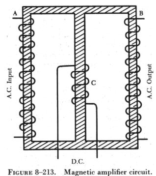 By making the dc input to coil C continuously variable from 0 to 30 milliamperes and maintaining an input of 1 ampere on coil A, it is possible to control the output of coil B to any point between 0.24 ampere and 1 ampere in this example. The term "amplifier" is used for this arrangement because, by use of a few milliamperes, control of an output of 1 or more amperes is obtained.