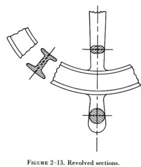 In a half section, the cutting plane extends only halfway across the object, leaving the other half of the object as an exterior view. Half sections are used to advantage with symmetrical objects to show both the interior and exterior. Figure 2-12 is a half sectional view of a quick disconnect used in aircraft fluid systems. Revolved Sections A revolved section drawn directly on the exterior view shows the shape of the cross section of a part, such as the spoke of a wheel. An example of a revolved section is shown in figure 2-13. Removed Sections Removed sections illustrate particular parts of an object. They are drawn like revolved sections, except that they are placed at one side and, to bring out pertinent details, are often drawn to a larger scale than the view on which they are indicated. |