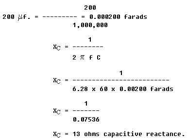 In figure 8-191, a series circuit is illustrated in which a capacitor of 200 mf is connected in series with a 10 ohm lamp. What is the value of the impedance, the current flow, and the voltage drop across the lamp? |