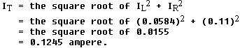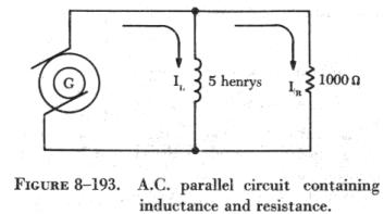 | The methods used in solving parallel ac circuit problems are basically the same as those used for series ac circuits. Out of phase voltages and currents can be added by using the law of right triangles, but in solving circuit problems, the currents through the branches are added, since the voltage drops across the various branches are the same and are equal to the applied voltage. In figure 8-193, a parallel ac circuit containing an inductance and a resistance is shown schematically. The current flowing through the inductance, IL, is 0.0584 ampere, and the current flowing through the resistance is 0.11 ampere. What is the total current in the circuit? |